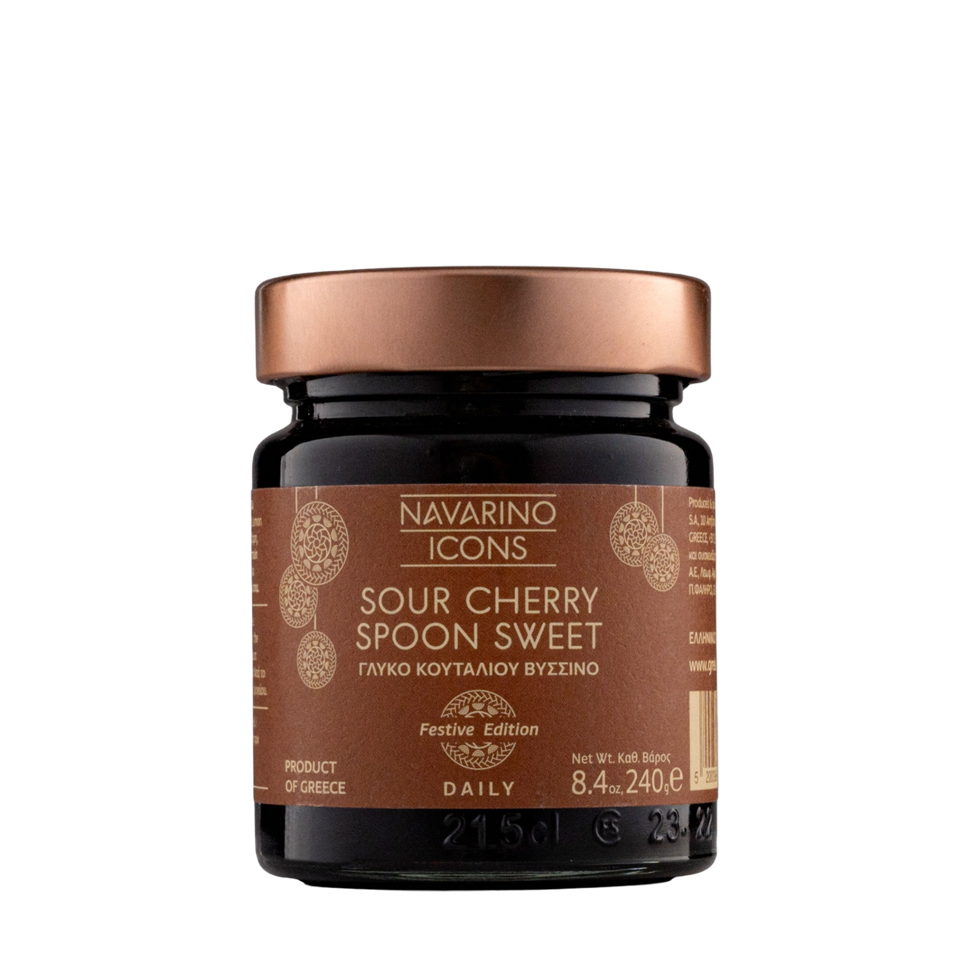 Experience authentic Greek hospitality with Navarino Icons Sour Cherry Spoon Sweet. This "Festive Edition" is crafted from hand-picked Messinian cherries, simmered for days to perfection. A luxury Vissino Glyko for yogurt, ice cream, or cheese.