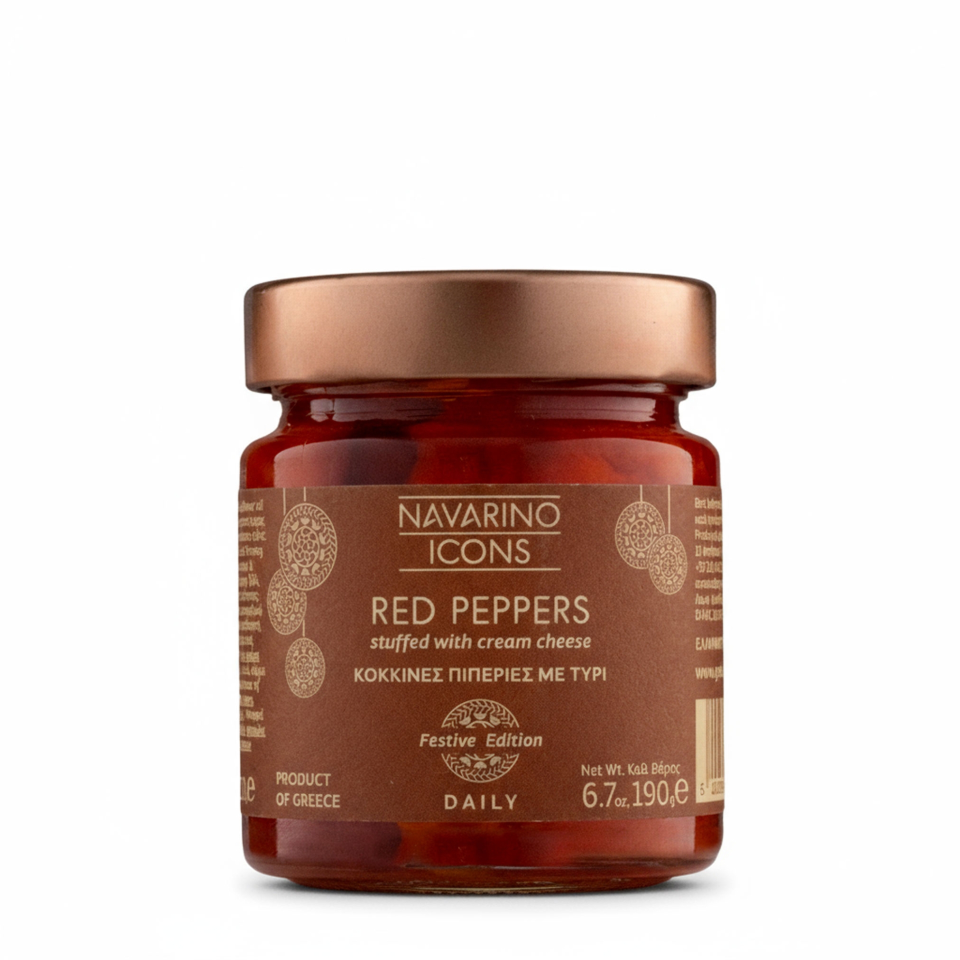 Discover Navarino Icons' gourmet stuffed peppers, hand-filled with rich, velvety cream cheese. This vibrant, ready-to-serve Greek appetizer balances sweet and savory, making it a perfect addition to any festive table or luxury antipasti platter.
