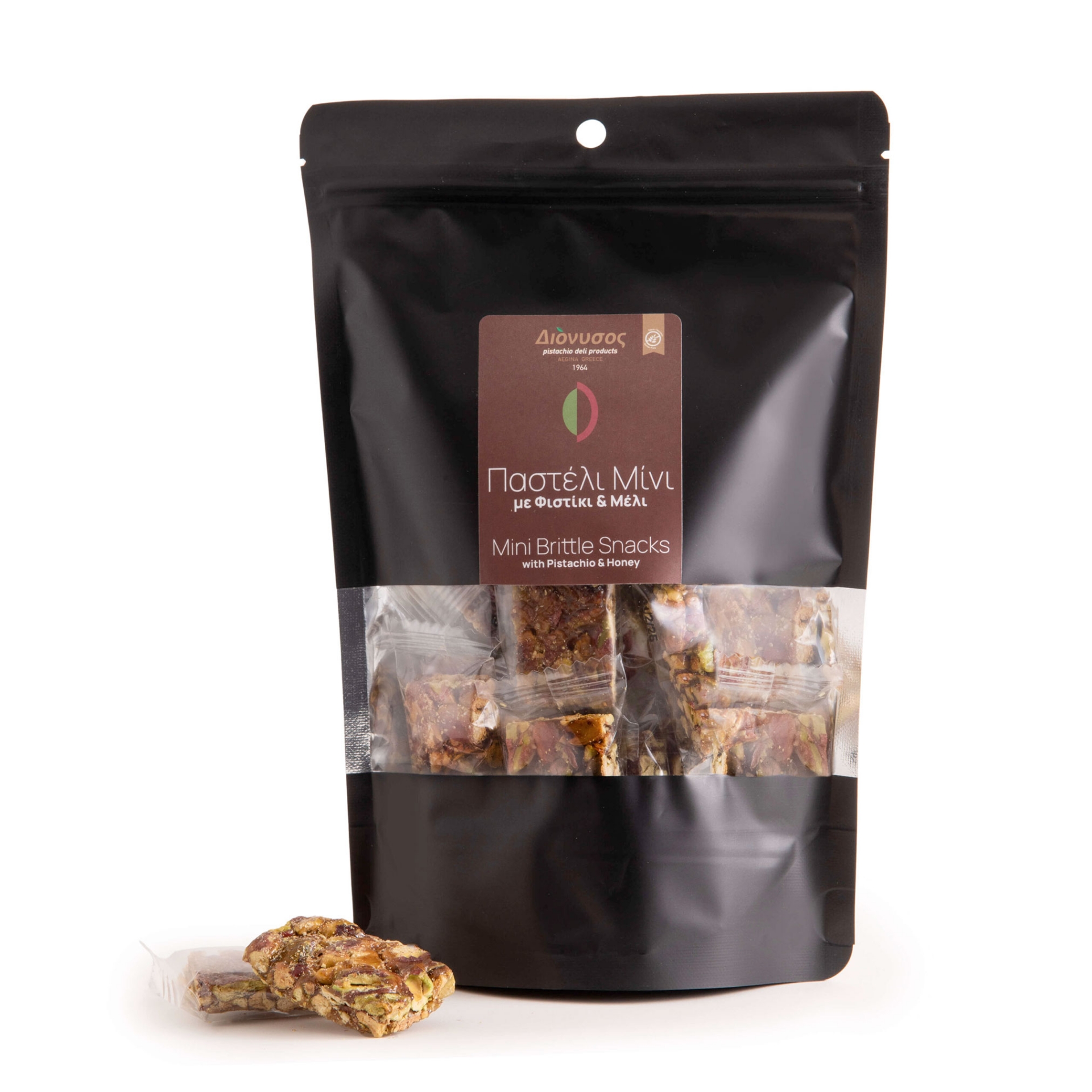 Elevate your snacking experience with our Premium Mini Brittle Snacks with Pistachio Aegina PDO & Honey. A luxurious blend of authentic ingredients, rich flavors, and natural goodness awaits.